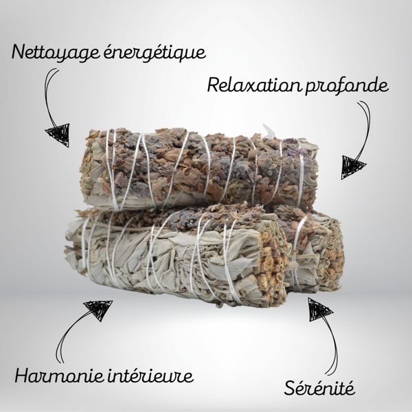 Ce duo sauge blanche & lavande t’aide à faire de la place, à purifier, mais sans agitation. C’est une fumigation qui calme autant qu’elle nettoie. Elle aide à relâcher, à retrouver un souffle plus ample, et une paix douce dans ton espace.
